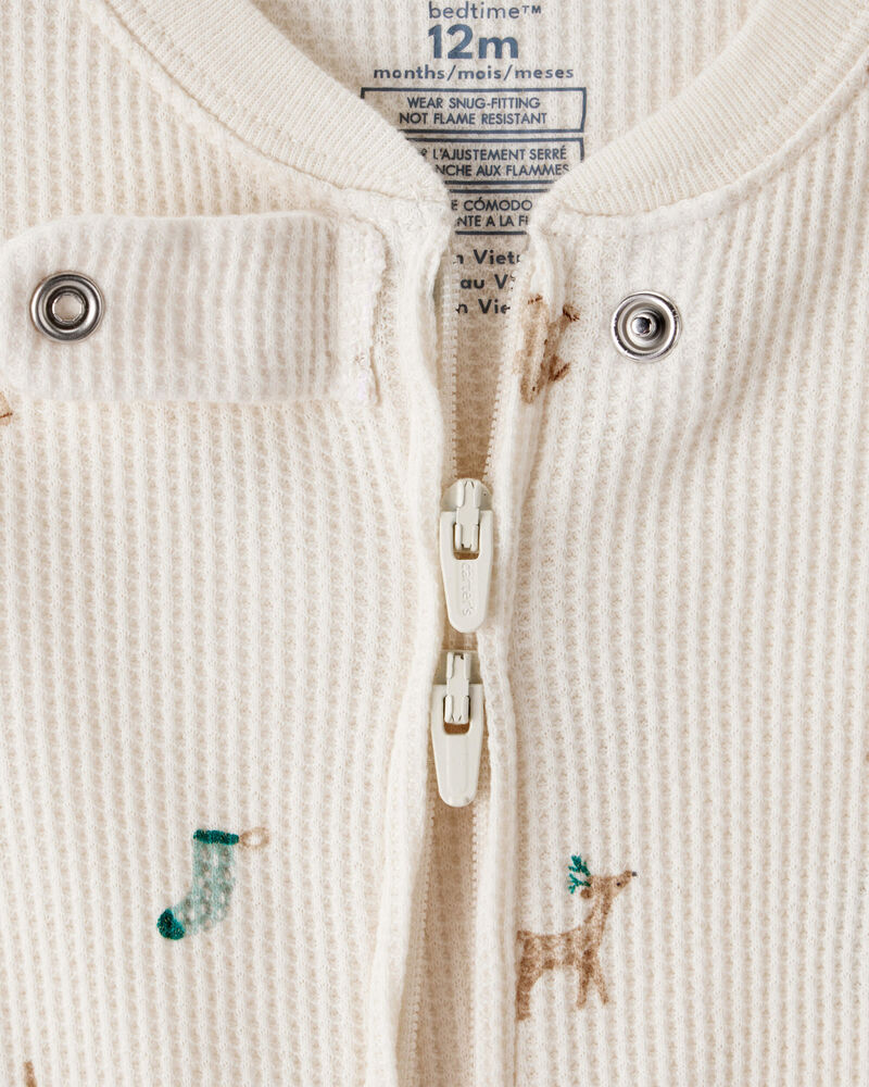 Snuggle baby up and spread the holiday cheer with in this Christmas PJ. Crafted in a cozy cotton blend, these PJs feature a delightful candy cane and reindeer print that makes bedtime feel like a festive celebration. Designed for chilly winter nights, the snug fit and long sleeves provide ultimate warmth and comfort, ensuring your little ones stay cozy while dreaming of sugarplums. Plus, with easy zip-up dressing and machine washability, busy parents can enjoy hassle-free nights, making these pyjamas a must-have for the season!