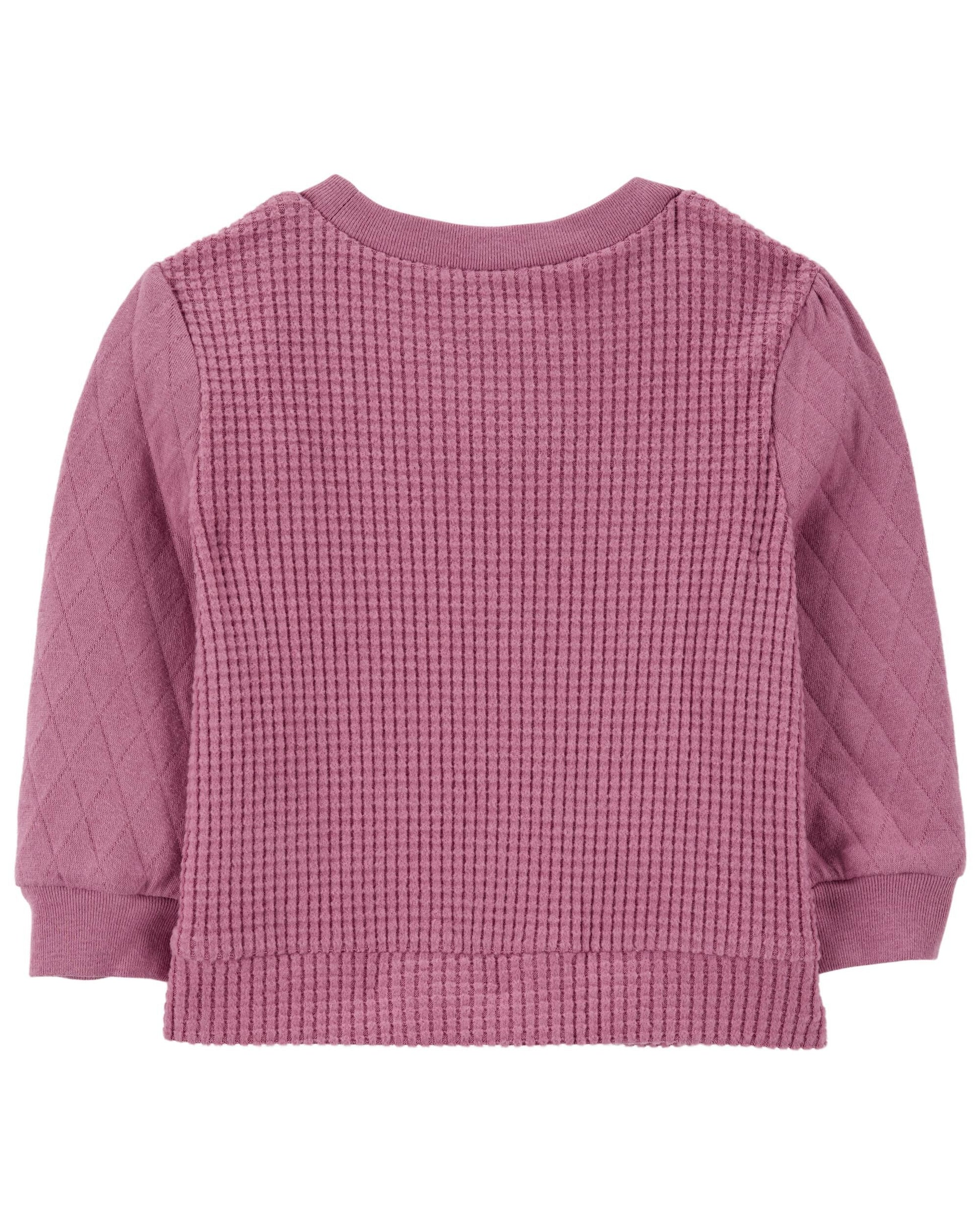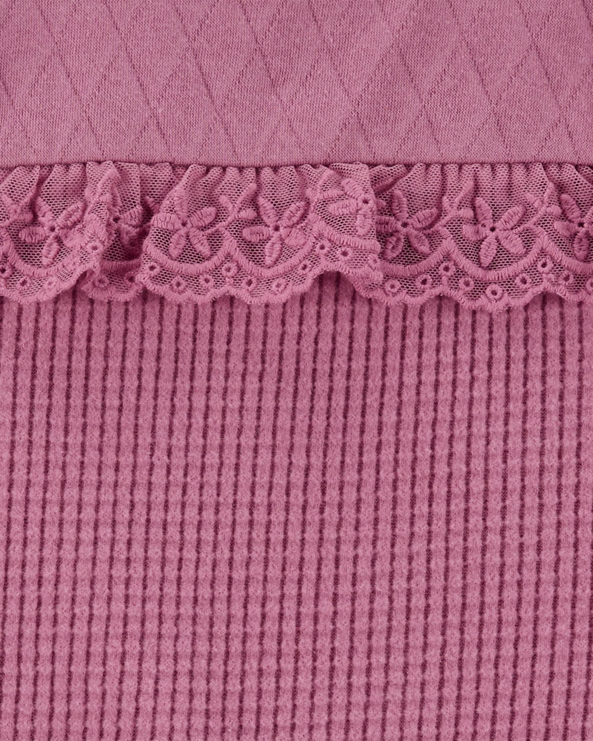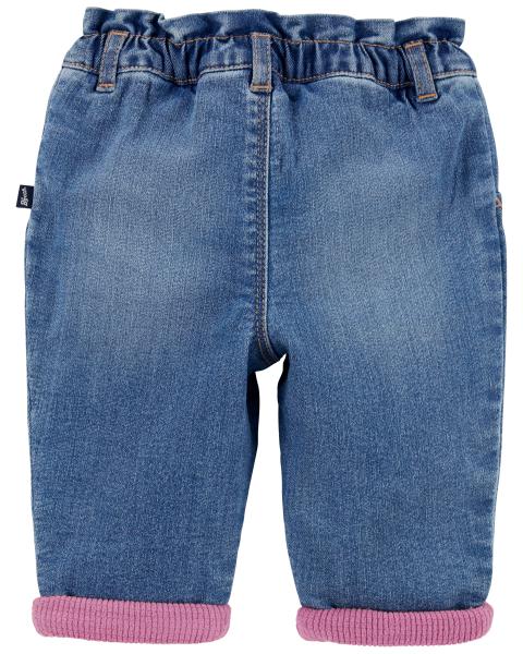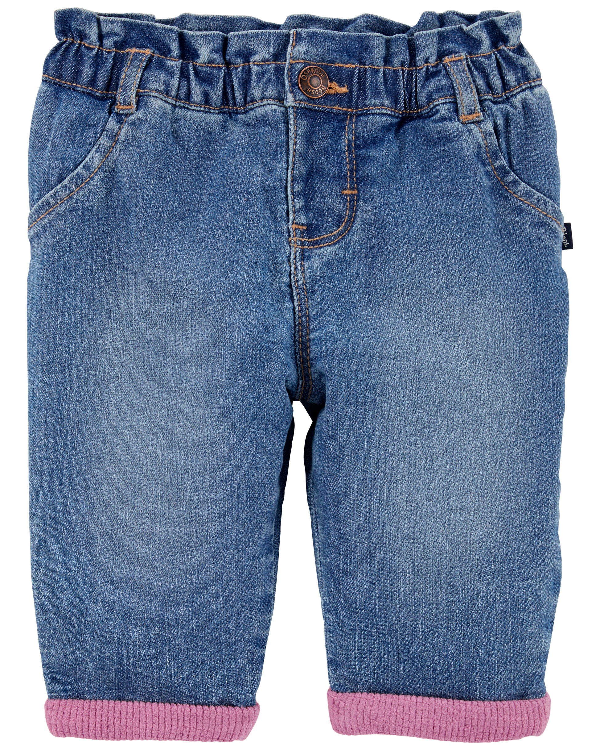 This cozy long-sleeve top features quilted and thermal details with stylish lace trim, keeping your baby warm and comfortable. The soft, stretchy jean pants are lined with thermal knit and have an elastic waist for easy dressing. Perfect for cooler days and quick changes.